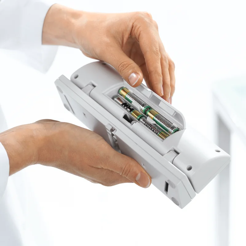 La báscula ofrece versatilidad en su alimentación, funcionando con baterías estándar o mediante adaptador de corriente opcional, adaptándose a las necesidades específicas de cada entorno clínico.